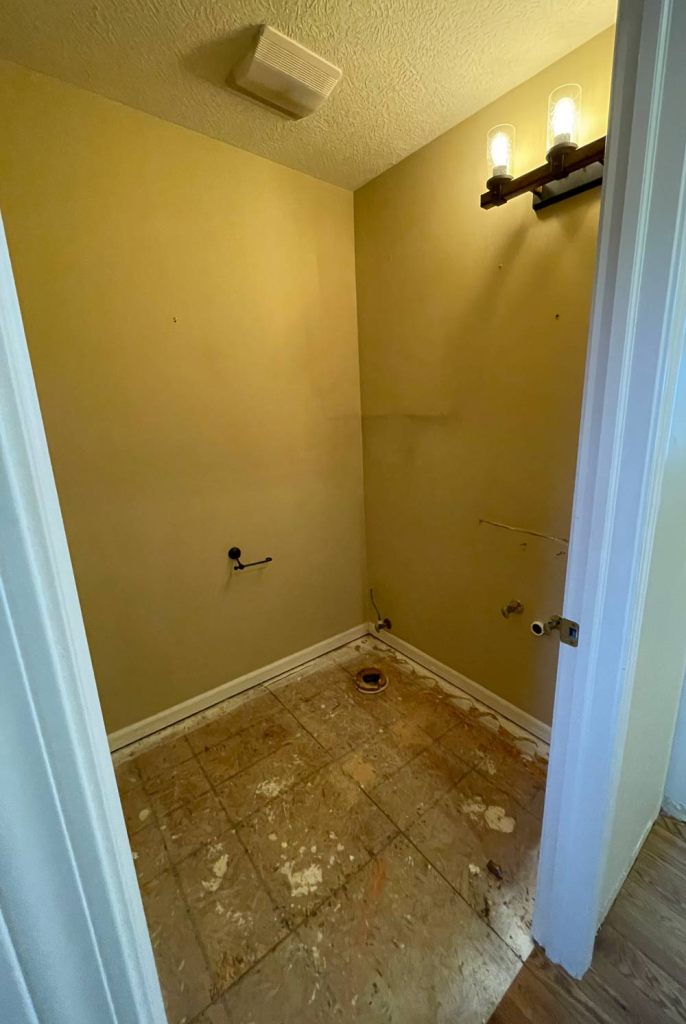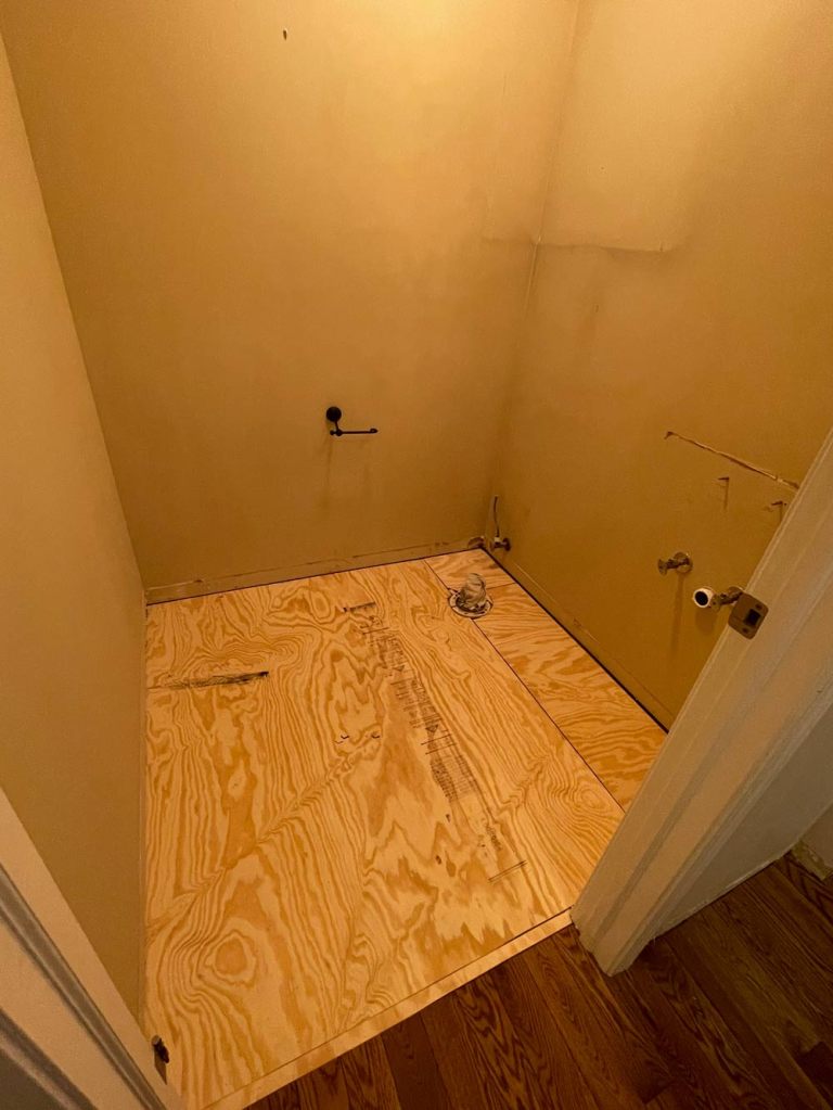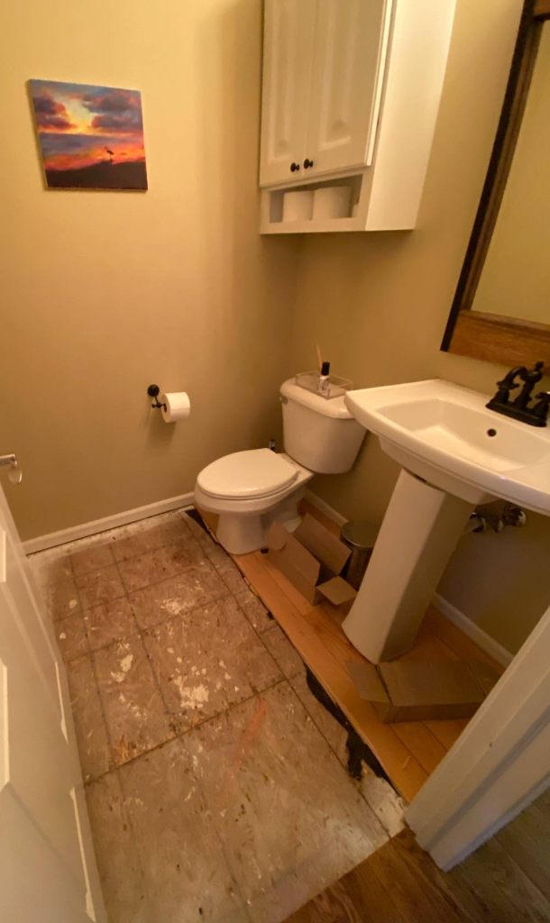 If you’re working in a bathroom, you need to remove the toilet and, if you have a pedestal sink, you need to remove that too. This is MUCH easier to do than I anticipated! You will need latex or nitrile gloves, a large sponge, and a bucket for the toilet and a towel and a small bucket or plastic tupperware container for the sink. I also recommend having a partner help you move the toilet because it can be pretty heavy. The bottom of the toilet is covered in sticky wax, so make sure you place the toilet on a tarp, towel, or cement surface you do not care about instead of your floor . Here are the videos I followed to remove the toilet and the sink (I have a pedestal sink):