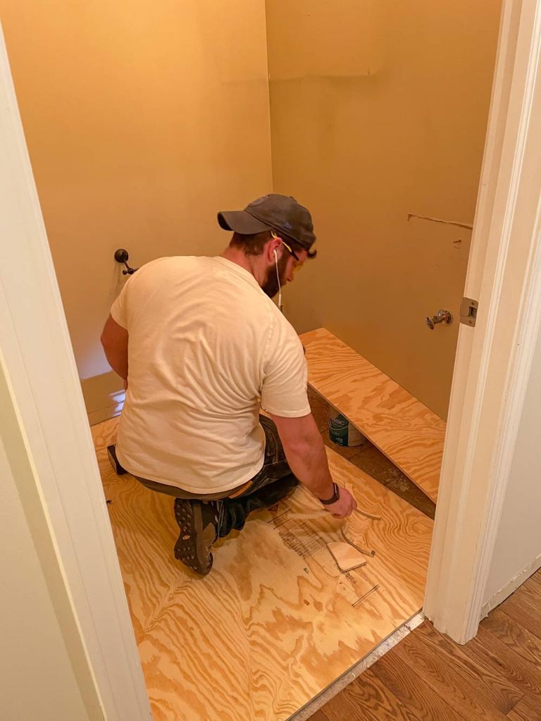 Use wood screws to screw the plywood down onto the subfloor. Insert screws six inches apart in all directions, so the underlayment has a giant grid of screws. This will take a while to do, but it will ensure your floor does not squeak after you install the tile. Some installers use wood glue or liquid nails to bond the plywood to the subfloor, but many installers advise against doing that. I decided not to glue the plywood to the subfloor because, in my opinion, if you ever want to change your flooring in the future or have a professional do it for you, it takes way more time, effort, and materials to remove the underlayment from the subfloor if it is glued down. You’d likely need to replace your subfloor. As a DIYer if I messed up or the tile failed, it would be A LOT more work to redo everything if I glued the plywood to the subfloor. That being said, I have a confession to make: I did not screw the plywood to the subfloor. I used a crap ton of 1 5/8 ” nails. Please DO NOT do what I did. I was too eager to get started on tiling, and I didn’t have any wood screws on hand. Trey insisted that it would be fine if I just used nails in the nail gun, so I gave in to convenience despite my research. So far I haven’t observed any consequences of this choice, but I’m already regretting it because I know it’s just a matter of time before I notice annoying squeaks when I walk on the floor. Once you finish screwing your plywood to the floor, it is time to prep for the uncoupling membrane!